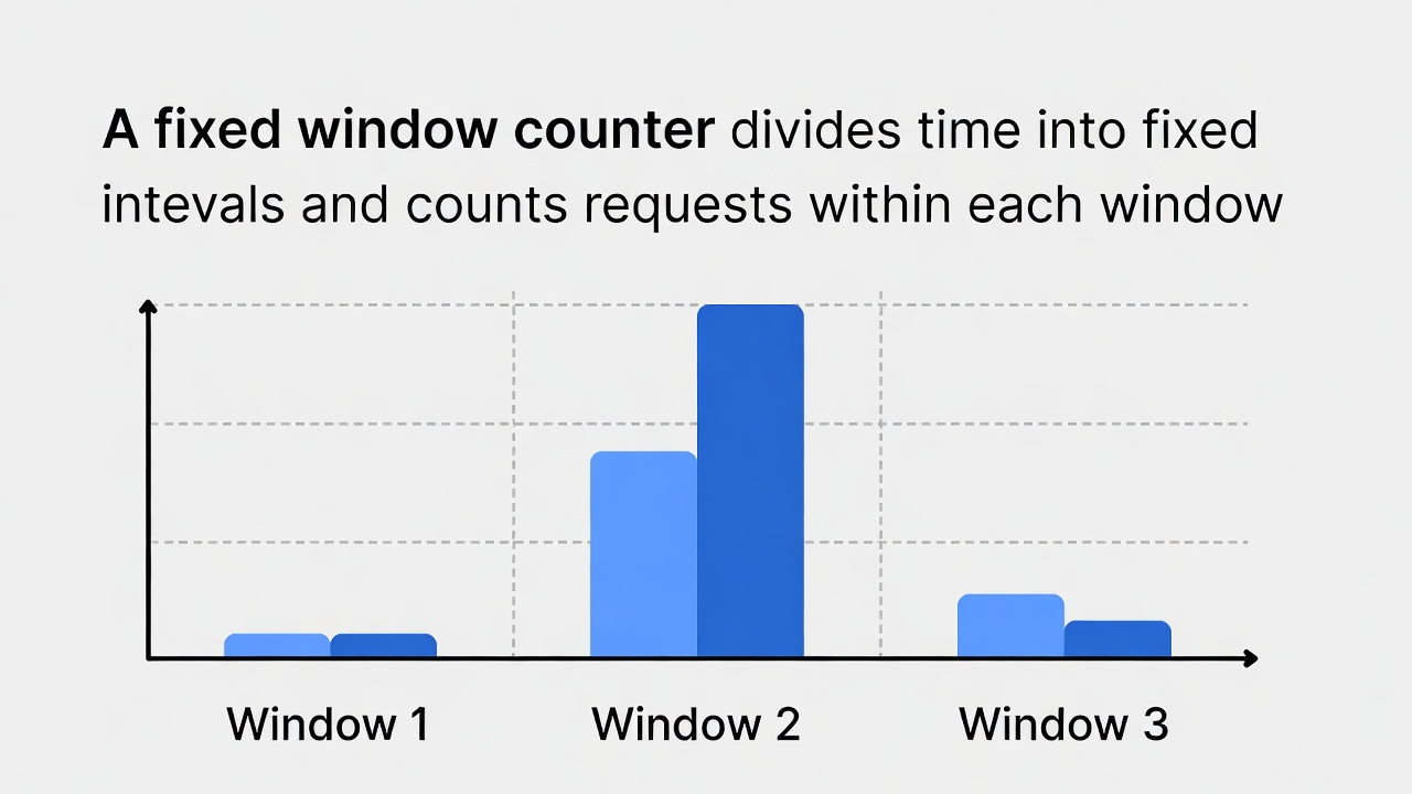 A fixed window counter divides time into fixed intervals and counts requests within each window.