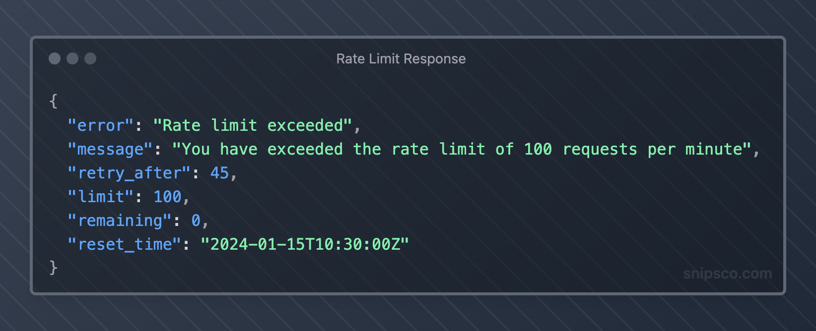 When rate limiting triggers, return informative error responses that help clients understand what happened and how to proceed.